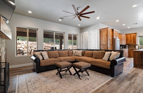 Our guests love the open floor plan that guarantees space for everyone to gather and relax! The home includes 2 large family rooms with comfortable couches and large televisions with excellent sound systems. The open concept kitchen is spacious and well-appointed. There is every appliance you have at home, multiple sets of pots and pans, and baking equipment. There are 2 refrigerators for extra supplies, and a whole house water filtration system with Reverse Osmosis for drinking water. You'll have everything you need to cook for a large group!