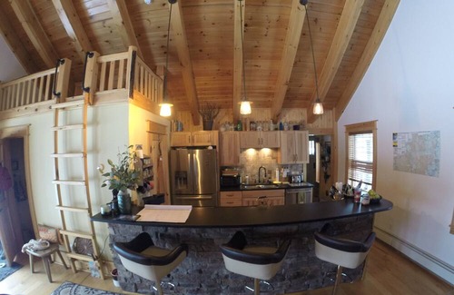 Escape the city and be with nature at this spacious 3 bedroom double bungalow ranch house with tall ceilings, natural stone, and custom pine woodwork throughout. An authentic North Country Adirondack home, perfect for a memorable family vacation or a fun group getaway. Open concept living/kitchen area for socializing and entertainment. Huge dining table with 8 seats.