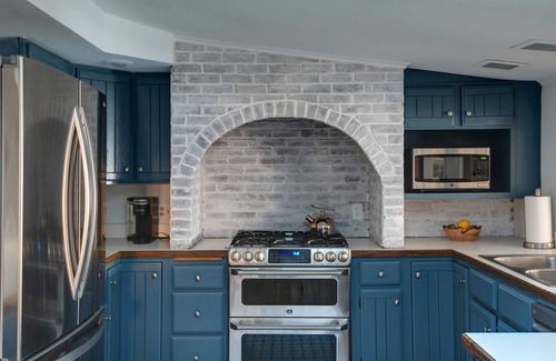 There are 3 different levels to this house. When you enter via the mudroom, you will walk into the kitchen. To the right(overlooking the lake), there are 3 steps down to the sitting room (with a gas fireplace), dining area, porch, and Primary/King bedroom with ensuite. To the left of the mudroom, you will enter the living room with a large sectional sofa. Off of that living room, is the 2nd bedroom with queen bed, a full bathroom and a laundry room. In this living room, there's a regular set of stairs to the room with the 4 twin beds.