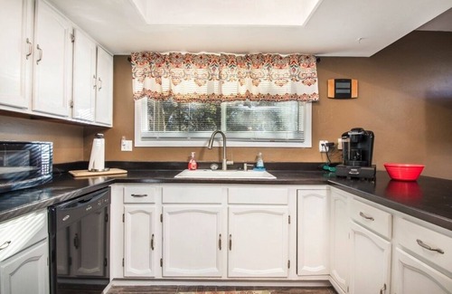 The modern kitchen and dining area is the centerpiece of the main level. You’ll find all the basics you’ll need for whipping up tasty meals for the whole family, plus additional amenities like a Keurig with complimentary coffee to help you start your mornings off right. Once it’s time to eat, you can enjoy group meals at the large dining table or take a seat at the extended kitchen island.