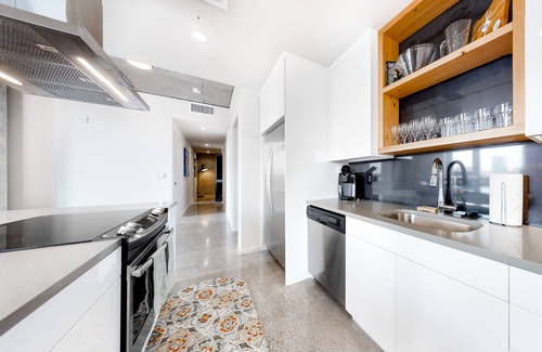 Cocooned in walls of polished concrete, this rental boasts a unique, modern character and is wonderfully insulated against the city streets outside. The sofa in the living room nook is the perfect place to curl up with a novel from Powell's as the rain falls outside, or to watch a movie on the flatscreen TV.