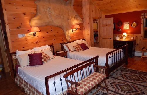 Expansive and airy, the Bear Room at Kiwassa Lake B&B, an Adirondack B&B, is located on the second floor, and is our only suite in the B&B with a fireplace and the only room that can accommodate up to four guests. This Adirondack suite is simple, elegant and tasteful with eastern exposure ensuring a bright and sunny morning. The decor is casual and contemporary influence meld with an emphasis on the Adirondacks. Guests of the Bear Room sleep below a life size bear rug hanging from the knotty pine interior while enjoying a relaxing, roaring fire. Located on the second floor, the eastern-facing windows look to Adirondack Kiwassa maples and forested acreage. For quiet nights, there is a sitting area in the Bear Room.