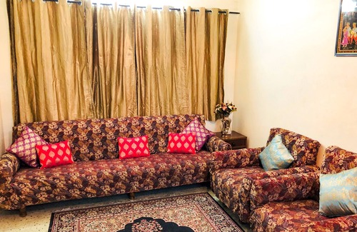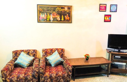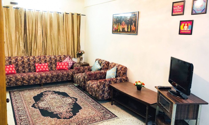 3 bedroom, 2 bathroom apartment in a professionally managed building with elevator. Master bedroom has a king sized bed, second bedroom with a single bed, third bedroom has a queen bed. Additional mattresses can be provided on request. There is AC present in 2 bedrooms but no air conditioner in the third bedroom. Fans are provided in all rooms. Living room has TV with cable channels. Full kitchen in the apartment with pots, pans, plates, utensils, toaster, induction cooker, microwave and refrigerator. RO water filter for drinking water. Dining room has seating for 4-6. Washing machine in unit.