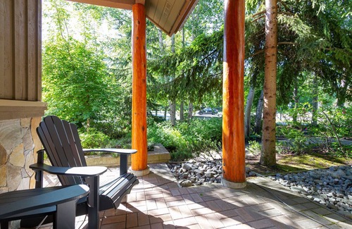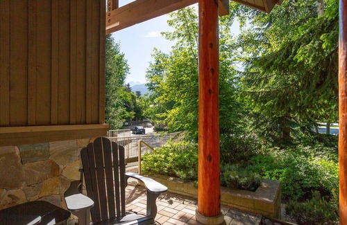 - private patio with two Adirondack chairs with peakaboo views of the mountains.
