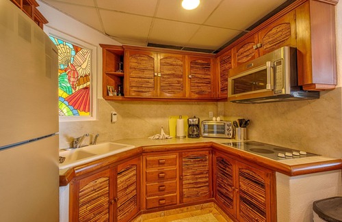 Cultural artwork and handicrafts bring a sense of place, while central air conditioning throughout ensures year-round comfort. Guests may also let in the Caribbean breezes by opening sliding glass doors across the three patios.