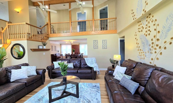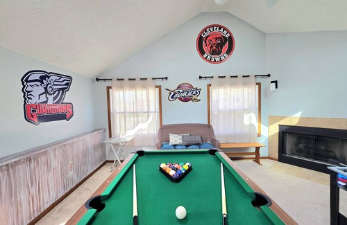 Hidden in a quiet neighborhood yet minutes from I-480, this spacious home is a retreat for comfort and fun. With over 3700 square feet of living space, it's perfect for large groups. Luxurious beds, cozy leather furniture, and a fully equipped kitchen set the stage for relaxation. You will love your mornings in the sunroom, where golden light dances and coffee tastes even better. When the energy rises, the Cleveland sports-themed game room becomes your playground, brimming with endless fun and competition. This is your sanctuary of laughter, relaxation, and togetherness.