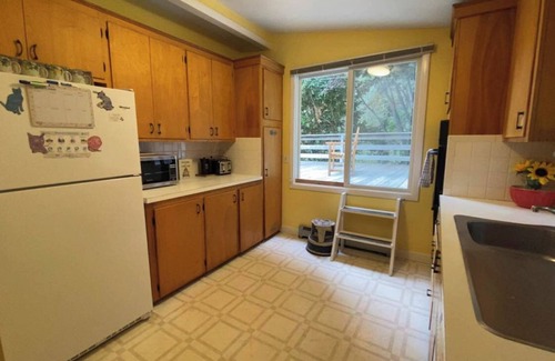 Fully equipped kitchen with a one-of-a-kind sliding window that opens directly to the back deck, complete with steps leading outside—perfect for passing snacks and drinks or enjoying seamless indoor-outdoor living.