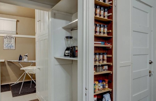 Each of the five bedrooms are tastefully decorated and have an updated 1920's vibe. Both primary bedrooms feature comfortable beds and lovely decor. The other three bedrooms also offer an amazing place to wake up in the morning, with comfortable beds and an inviting feel. Both bathrooms are conveniently located. The upstairs bathroom features a tub/ shower combination and the downstairs bathroom provides a shower. A laundry room with a washer and dryer are available for your convenience.