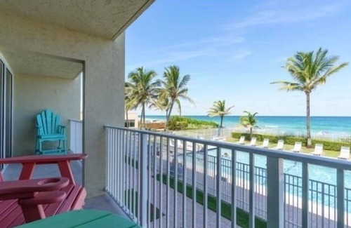 Escape to our newly renovated beachfront retreat, adorned with charming coastal decor and offering breathtaking ocean and pool views from the balconies. Located on the second floor, right in the center of the building, the condo provides stunning views of both the pool and the ocean.