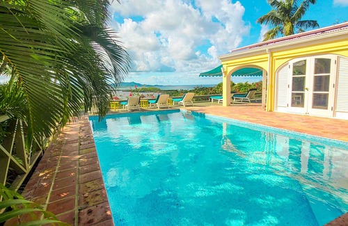 Our Property Manager, Jamie Lammering, will greet you at the airport. Jamie is originally from the midwest and has been on St. Croix since 2005. She loves this sunny island as her home, and enjoys vacationers falling in love with the house, and the island. Once you've picked up your rental car, Jamie will escort you to The Yellow Coconut. The entrance has a spacious parking area and professionally landscaped walkway to the arched front door and side courtyard. When you open the front door, you will notice the breezeway leads you to the large, saline heated pool, as well as the master bedroom suite, and the remainder of the house. The pool is kept at a comfortable 86 degrees year round. There are NO STAIRS anywhere in the house, making it easy to wheel or carry your luggage to your room.