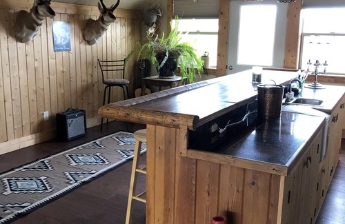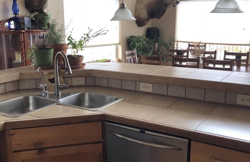 Beautiful large 3 bedroom 2 1/2 bath home w/loft and wet bar. 7 miles NE of Cody Wyoming. 57 miles from the East entrance of Yellowstone National Park. Private location with views of McCulloch peaks & Heart Mountain. Large courtyard with fire pit for family gatherings. Large backyard with volleyball net. Barbecue grill sleeps six accommodates up to 12 people. Pets are allowed with a deposit. Very quiet and peaceful location . Lots of wildlife .hunters welcomed .