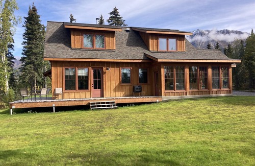 Our home is situated on 1 1/2 acres in the historic town of McCarthy with spectacular views of the Kennicott Glacier and the Wrangell Mountains. Enjoy all the comforts of home in this spacious, modern home with 3 bedrooms, a loft, 2 bathrooms, a full kitchen, sunroom, and a deck with a view. Our solar electric system provides the power for radiant in floor heat, lighting, washer and dryer, refrigerator, and dishwasher. The perfect place for family (sleeps 10 and kids under 12 no extra guest fee) and friends to experience all that Wrangell-St. Elias National Park has to offer.