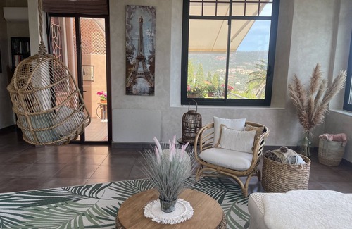 The salon features a L shape couch, bamboo swing chair and extra bamboo chair and Boho pouf with palm tree rug.