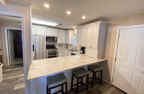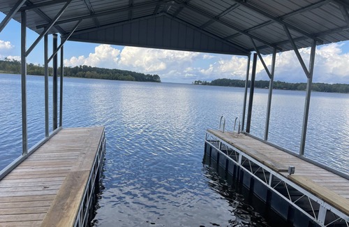 Come enjoy breathtaking views at this updated 4 Bedroom 2 Bath lake house with gentle slopes to the bulkhead and fishing dock. The home features two Bedrooms and a Bathroom downstairs as well as a Prime Bedroom and fourth Bedroom with Bathroom upstairs. The newly updated Kitchen with Whirlpool appliances, cabinets and granite countertop, is well stocked with all the cookware and serving items you will need to prepare and serve ample meals. There is a Breezeway at the home's entrance connecting to the Laundry Room. There is a newly added large covered Porch with a Northern view facing the lake. There is a swing near the bulkhead where you can enjoy beautiful sunsets. We have a propane grill/griddle for your use and require grille mats to be used (we provide) to keep grease off the grille. If we have to clean, we will assess a cleaning fee. We recently added a outdoor fire pit (fire wood stacked nearby) for you to use., as well as two fishing kayaks (extra fees apply).