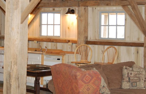 This is a pre-civil war barn with original beams and foundation stones. A large common area contains a full kitchen with modern appliances and the living area has a sofa and 3 twin beds for additional guests. Additionally, there is one private bedroom with a double bed and two bathrooms with showers in each. Located on a picturesque tree lined country road that's great for taking a leisurely walk. This is an ideal destination for rest and relaxation in a beautiful quiet country setting.