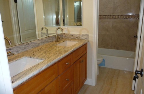 Our bathroom is uniquely designed to accommodate two people simultaneously. The shower and toilet have their own separate door, distinct from the area with two sinks, allowing up to three people to use the bathroom concurrently.