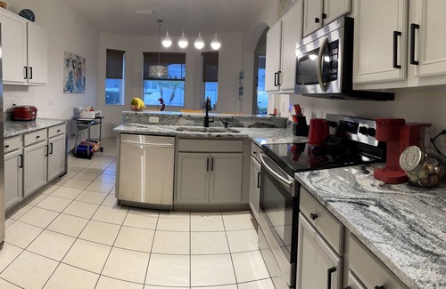 You will find a leather sectional and leather chairs which are all comfy for TV watching on our 70 inch flat screen TV with surround sound. The kids of all ages will enjoy our PS3 and the games provided. In the cabinet you will find movies for the kids and adults and many books and travel guides. We offer free Netflix for your enjoyment after a busy day at the parks. Disney +, ESPN etc are also available.