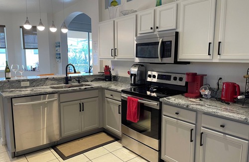 The kitchen is fully equipped with stainless steel major and a variety of bright red minor appliances. We have just updated with grey cabinets and gorgeous new granite countertops. There is also a beautiful new high efficiency washer and dryer. You should find everything you need! We even supply you with washing detergent and dishwasher tabs for your stay.