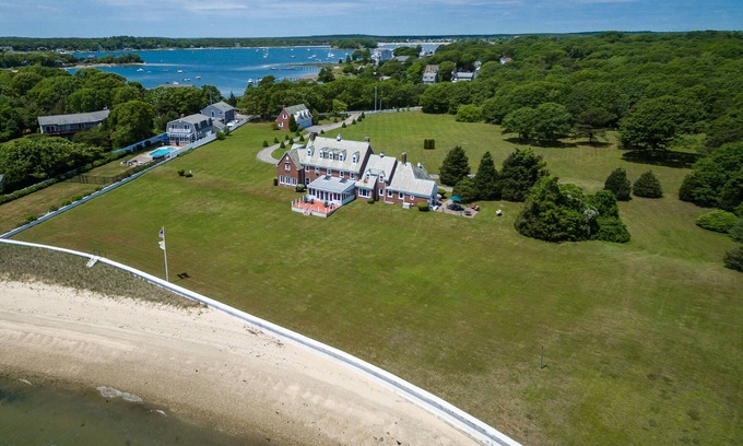Imagine your vacation or event on this remarkable eight acre waterfront estate boasting over 300 feet of private sandy beach frontage on beautiful Buzzard's Bay. Nearly every room in this stately historic brick mansion showcases incredible water views and provides plenty of space for rest, entertainment, and recreation for large groups up to 18 guests! This property has the quintessential Cape Cod style with sprawling lawns, a large deck, and classic details not found in modern homes.