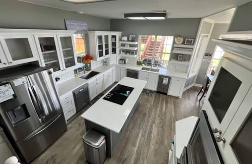 The downstairs living space spans over 40 feet wide so you will never feel cramped even with a large group. The kitchen is updated with stainless steel appliances, cookware, dishes and even a coffee bar (so bring your favorite K cups). There is no need to run to the store since the built in ice machine produces lots of ice per day. There is a full size refrigerator stocked with your basic condiments, ground coffee, and a wine rack which includes your first bottle complimentary with your stay. You will find a large pantry to store all your groceries. There is also an extra full size fridge for extra storage of groceries during your stay.