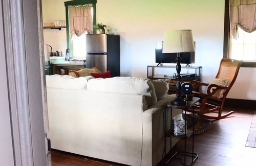 In the original two rooms, you will find a downstairs living room with a love seat, soft chair, and rocking chair arranged around a walk-in fireplace. A smart TV and Wifi are available for your entertainment.