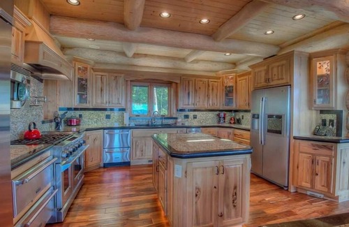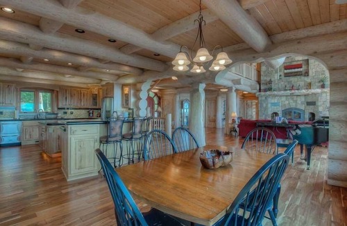 It took five years to build this resort-style lodge, and you can clearly see why. SpyGlass is the stuff of fairy tales. Every detail, from the large log cross-beamed ceilings down to the polished wood floors, is dressed in elegance. Marvel at the great room's grandeur, with its 32 ft. vaulted ceiling, imposing iron chandelier, custom woodcarvings of wildlife adorning the walls, and huge stone fireplace as the room's centerpiece. The curved, windowed wall has built-in seating for a perfect view of the hills and starlit sky. There's no better place than here to ring in the New Year with your favorite friends, champagne and a roaring fire.