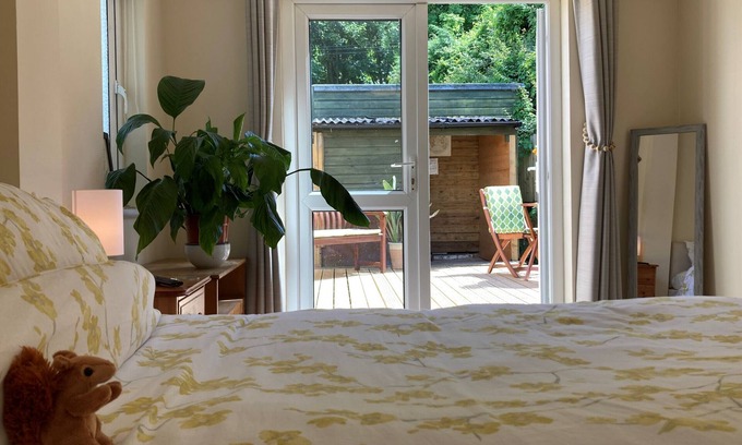 This well presented, holiday home which sits alongside the owner’s main residence is dog friendly and can accommodate up to three guests, the accommodation comprises of one spacious and beautifully sunny bedroom with en-suite shower-room, It features a fully fitted kitchen, large sitting room with log burner and a private decking area with bike shed to its rear. The bedroom with its fantastically comfortable super king bed, can be offered as two singles on request