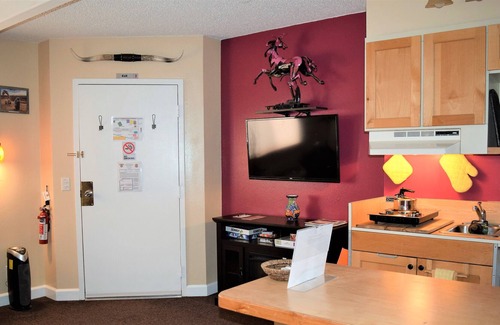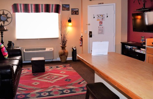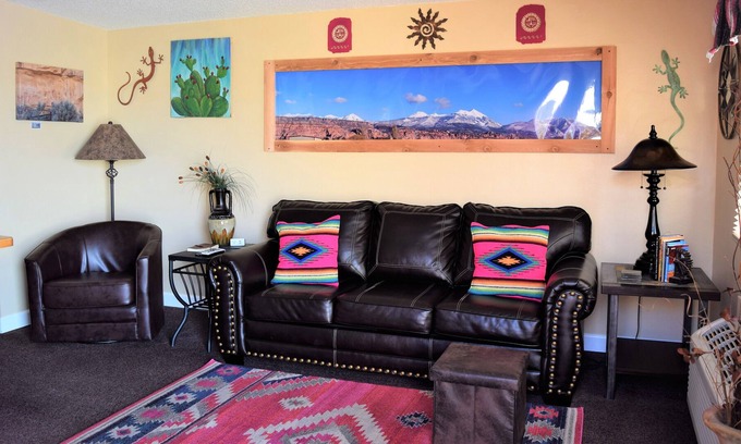 The Prickly Pear Adobe Cabin is about a 420 sq ft cabin which provides panoramic views of the Moab Rim, Spanish Valley & The La Sal Mountains with access to the surrounding National & State Parks, La Sal Mountain loop road & Ken's Lake Recreation Area. The cabin comes complete with a kitchenette, which includes a refrigerator, microwave, Keurig coffee maker, & double burner stove. A small living area has a flat screen TV with Direct TV and a sleeper sofa. Sleeping a total of (4) adults, a queen bed allows to sleep (2) guests, & the sofa bed folds out to sleep an additional (2) guests. The bathroom provides a tub with shower and the cabin comes completely stocked with linens, towels & toiletries at guest check-in (No daily housekeeping service is provided). The Prickly Pear Cabin has its own private entrance & parking, with additional parking for adventure equipment on property. Dogs are not allowed in this cabin.