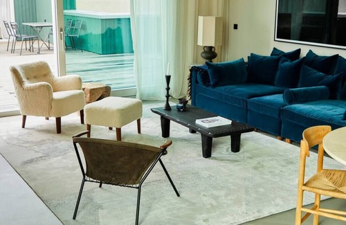A deep blue velvet sofa forms the heart of this apartment -the other furniture is decidedly understated in natural colors like cream, white and grey to underline its luminance. A wooden print by Markus Lüpertz and a photograph by Chris Tille round out the unique design of this apartment.