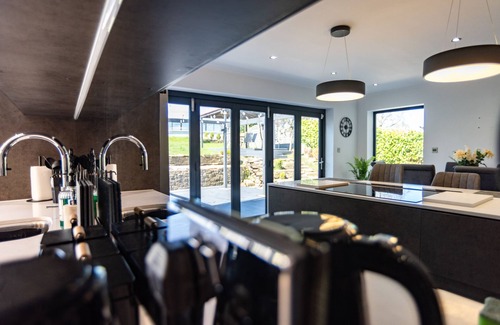The house comfortably accommodates 12 guests, with three ground-floor bedrooms ideal for easy access. The modern living room, open-plan breakfast and dining area, and spacious hallway create a welcoming atmosphere from the moment you step in.