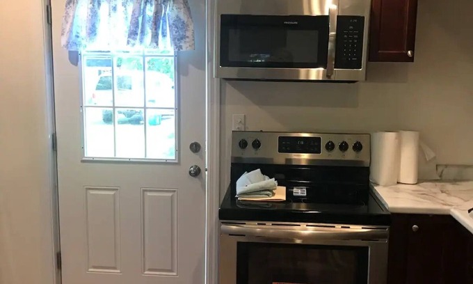 Quiet, comfortable 800 sq ft of space. Outdoor patio with grill for cooking. A full kitchen complete with dishwasher, stove and oven and large refrigerator. Large bathroom and bedroom. Comfy bed!! Desk for working. Overlooks a wooded area. Many have opined on how quiet and comfortable it is. The often say they are rejuvenated by the space!