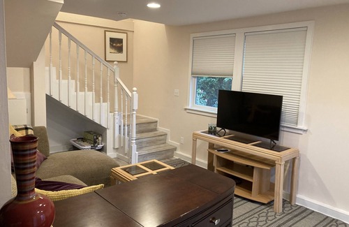 Cozy Ballard carriage house on Sunset Hill just behind owners 1890's farmhouse in a safe quiet neighborhood. Upstairs a very large bedroom with a posturepedic queen bed with Egyptian cotton sheets, private deck, powder room with bidet, sitting area, TV, and dresser. Main floor has inviting living space with cozy "L" shaped couch, smart TV, dining area with high top table and 4 bar chairs. Full kitchen with granite countertops, stainless steel appliances, plus washer and dryer. Main bathroom has a rain shower and river rock floor. front patio with guest BBQ and sitting area.