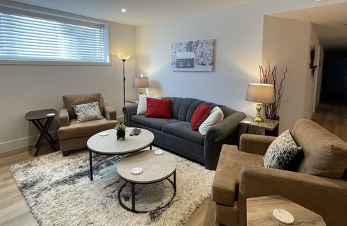 Relax at this upscale two bedroom "Condo Style" apartment in Collingwood with huge windows. Home was newly built in 2021, and located on an upscale street. Close to all amenities, including historic Downtown, famous Blue Mountain Ski Resort, numerous Golf Courses, Hiking, and of course the beautiful Georgian Bay. Sleeps six comfortably, with one Queen bed, one Double bed, and one Sofa bed. Cozy up to the fireplace after a day of skiing and relax in this spacious condo style basement apartment.