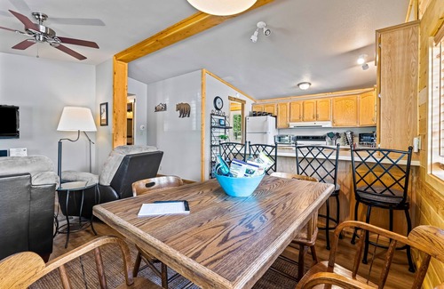 Step inside and feel right at home in the welcoming atmosphere. The cabin boasts comfortable furnishings, with two bedrooms featuring a queen bed and a queen bed and full bed, respectively. The open-concept living area features a Bluetooth stereo, a Roku TV, and a DVD player with select movies, so you can relax and unwind after a long day exploring the great outdoors. The kitchen is fully stocked with cooking equipment, an island, and barstools, perfect for preparing delicious meals and snacks.