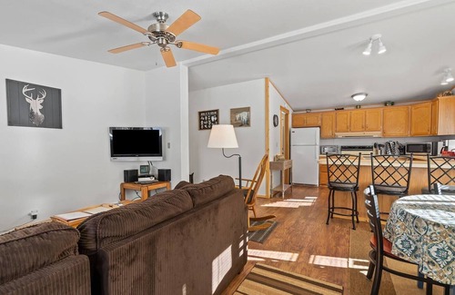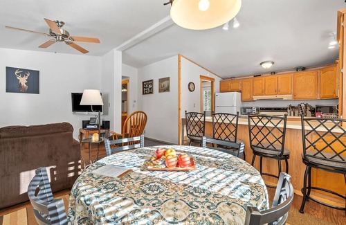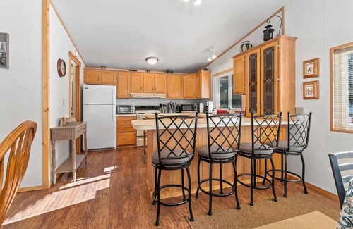 Inside, you'll find a fully equipped kitchen with an island and a 4-person dining table. The cozy living room features a Bluetooth stereo, TV with Roku TV and DVD player with select movies. The master bedroom boasts a comfortable queen-size bed, while the second bedroom includes a queen and full-size bed. The cabin also features 2 bathrooms and a washer and dryer.
