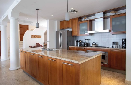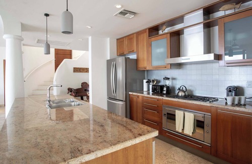 There are four bedrooms in the villa and each is equipped with high end electronics and entertainment centers. They all have luxurious private bathrooms, king sized beds, and impressive views of the sea. One of the bedrooms is on the main level and the remaining three are on the second floor.