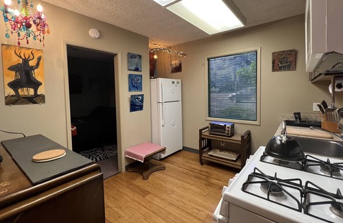 "Far out and out of this world! Perfect space for a couple or small family! Spacious two bedroom located right in the heart of downtown Ukiah, where there are plenty of shops and restaurants. Right in the mix of wine country, exotic redwood groves, and relaxing hot springs. Everything you need right within a few minutes of the Stardome, including a movie theater, library, and grocery stores like the Ukiah Food CO-OP. The space itself can be quite inspiring with unique art and accent pieces. The building itself is a small piece of history as it was once the local pharmacy with a unique architectural design. The apartment has a well equipped kitchen with all the tools needed to cook up a gourmet meal and dining table to present it. Even has a large tub great for tranquil soaking separate from the toilet, (a surprisingly significant plus). A shared laundry room is attached to the unit, and can be accessed from inside, which is also a huge plus. The pictures that are posted are great, but dont come close to the charm and thoughtfulness of this place."