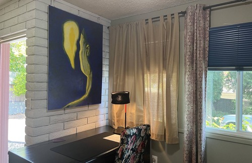 Centrally located, the home offers a nice outdoor seating area amidst trees. Of note is the artwork, simultaneously cosmic and shamanistic. A pleasurable stay with responsive hosts.