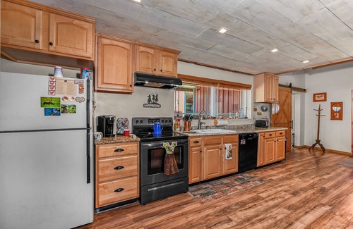Inside, warm wood tones and farmhouse decor blend with modern comforts. Relax in leather power recliners beside a pellet stove and soft lighting, or sip morning coffee at the kitchen window as seasonal lambs graze outside.