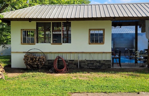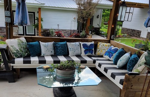 You will arrive at a privacy gate, and drive down a 600 ft. driveway. The apartment is at the end of the drive with no neighbors. It is peaceful, safe and quiet. The garage apartment is a brand new construction. My husband and I built this stunning place with comfort in mind. The place has a rustic elegance about it. The outdoor space is also has a very rustic feel. There is a lagoon behind the apartment that is full of nature, such as ducks, turtles, otters, geese. There is a sitting area under the balcony to drink a cup of coffee and enjoy the wildlife. You can also grill a burger under there. There's a gorgeous outdoir space that is shared with us, it includes small stove top, oven, sink, gas grill, refrigerator 3 separate seating areas, hot tub, outdoor shower, changing room and fireplace. We are outside the city limits, but a stones throw from great restaurants, entertainment, and the boats. The only thing missing is you!