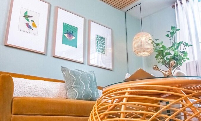 Professionally styled with playful green and pink hues, the apartment offers a refreshing and inviting ambiance. The living area features comfortable seating and a large flat-screen TV, perfect for relaxing after exploring the city.