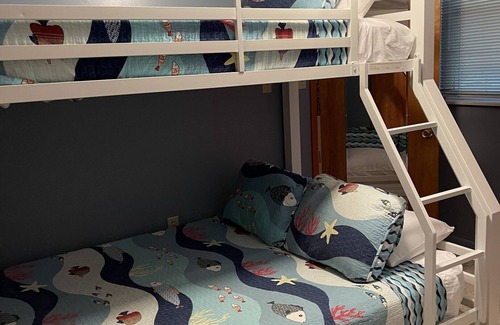 Inspired by historic architecture, this home combines the comfort of a vacation home with thoughtful features that makes it the perfect home for vacationing families. This two story cottage offers a full family room with sleeper sofa, kitchen, dining room and half bath on the main level. The second level contains three bedrooms and two full baths with one king, one queen and one set of bunk beds with a full on the bottom/twin on the top. A beautiful attached screened pool and brick patio are directly off the kitchen with plenty of space for your outdoor entertaining. An added charm is the semi-circle driveway that offers lush foliage and ample parking. This home is non-smoking, dog-friendly and offers complimentary wireless internet along with satellite television.