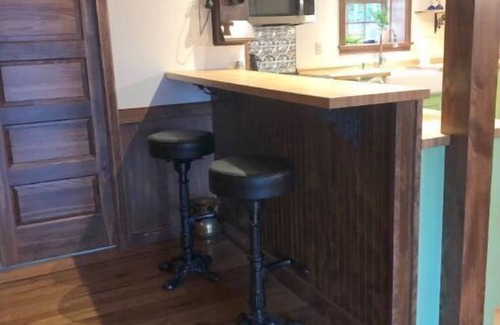 The kitchen is fully equipped with modern appliances and all the tools to satisfy the most discriminating foodie. The cupboard’s fully stocked with spices, flours, oils, and vinegars, and the fridge is stocked with all the condiments you want so you don’t have to worry about the little stuff. Is there coffee? Yes, both whole bean and ground. The small bar, a tribute to the home’s tavern origin, is never stocked out of respect for guests who may be in recovery; the Blue Mountain House is very much a BYOB establishment. Note: induction stoves, though super-efficient, only work with ferrous metals (steel, iron), so if you bring your favorite aluminum pot it will not work. However there are tons of high-quality ferrous pots, pans, dutch ovens, etc, etc onsite for you to use.