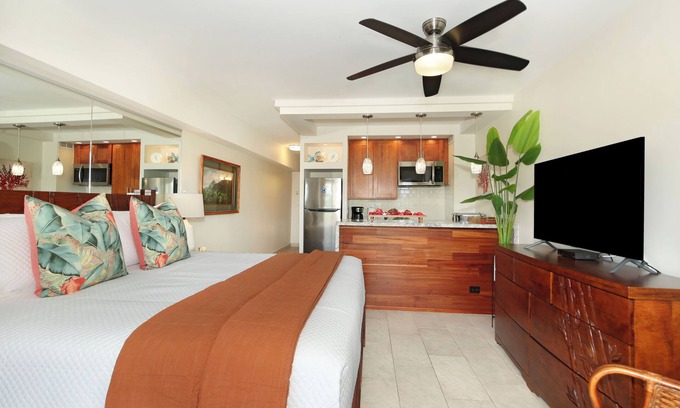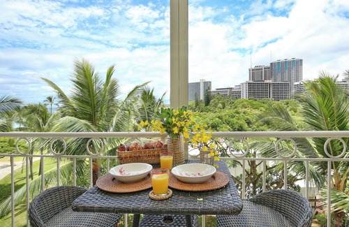 NEW TO OUR INVENTORY! Waikiki Shore is the only condo in Waikiki where you can step directly from the building onto the sands of Waikiki Beach! This exquisitely remodeled (2023) 5th-floor beachfront studio is a favorite with return guests! You'll feel right at home in this cozy rental with whisper-quiet split A/C, full kitchen, and free Wi-Fi. The unit has a 356-sqft interior plus 61-sqft balcony/lanai with table and chairs from which you'll enjoy fabulous partial ocean views and colorful sunsets!