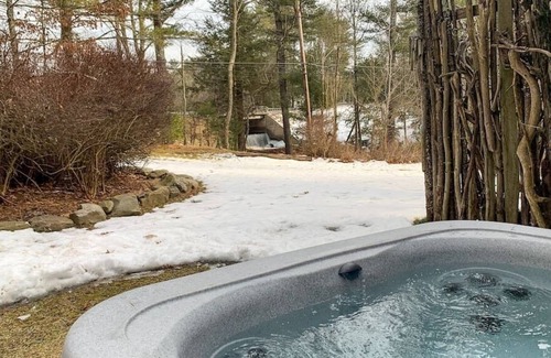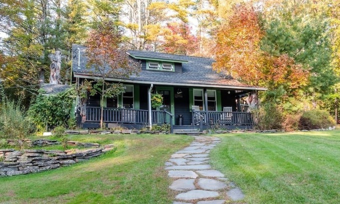 Set on a private wooded acre along a stream, the house has 2 BRs and 1 full bath. Amenities include a hot tub, wood-burning stove, BBQ, fire pit, game room, a charming stream, and access to the best hiking and dining in the region.