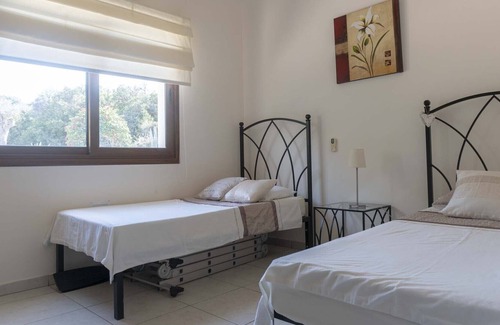 Inside the villa there are 2 bedrooms on the ground floor and a full bathroom. One bedroom has a double bed and a single bed, a dressing table and mirror and a double wardrobe. Double patio doors lead to the front garden (north) and a window to the rear garden (south)