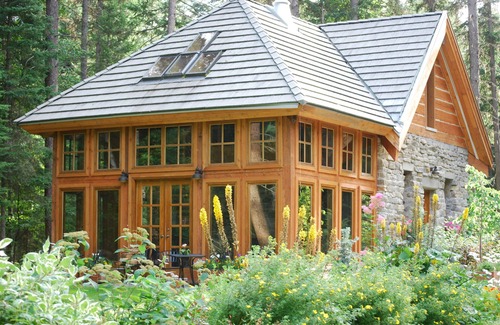 The post and beam structure of the Gatehouse was made from pine-beetle killed trees that were cut on the property. Stones for the exterior and interior were gathered locally from quarries and cliff sides but one stone from each of the mountain national parks of western North America were also embedded within the walls.
