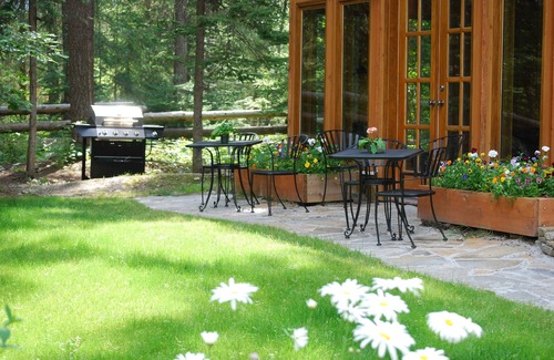 French doors open to a flagstone patio from which to enjoy a morning coffee or, for an evening barbecue to grill that perfect fresh caught trout. The patio overlooks a lovely flower garden with hummingbirds and butterflies and in the background, the glacial peaks of Mt. Robson, the highest mountain in the Canadian Rockies.