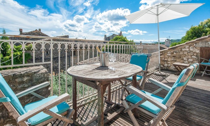 Discover this luminous stone village house, nestling in a pretty, quiet lane in the small village of St Laurent-de-Carnols. With its pretty courtyard and magnificent panoramic terrace, refreshed by the thickness of its walls and decorated with great taste, it will be ideal for a pleasant stay in the Gard.