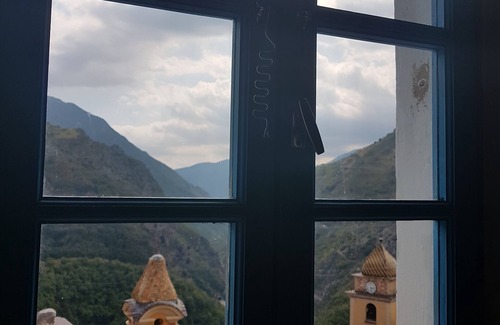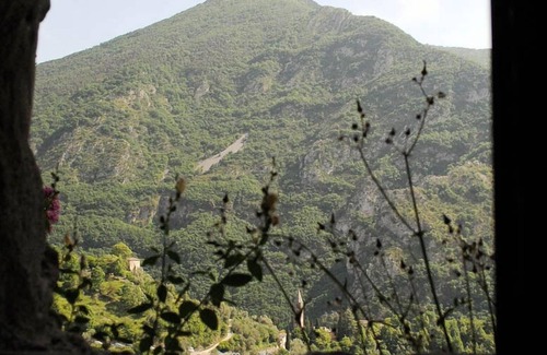 purple slate roofs, entirely pedestrian so very quiet (parking at the ends), the Maritime Alps in the valley of the Roya, 10 km of Italy, at 550m altitude in the trees. Access by train possible. (1km from Gare Village)
